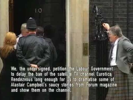 At the door of Number 10 Downing Street, Thomas hands in a petition asking the Labour Government ‘to delay the ban of the satellite TV channel Eurotica Rendez-Vous long enough for us to dramatise some of Alistair Campbell’s saucy stories from Forum magazine and show them on the channel.’